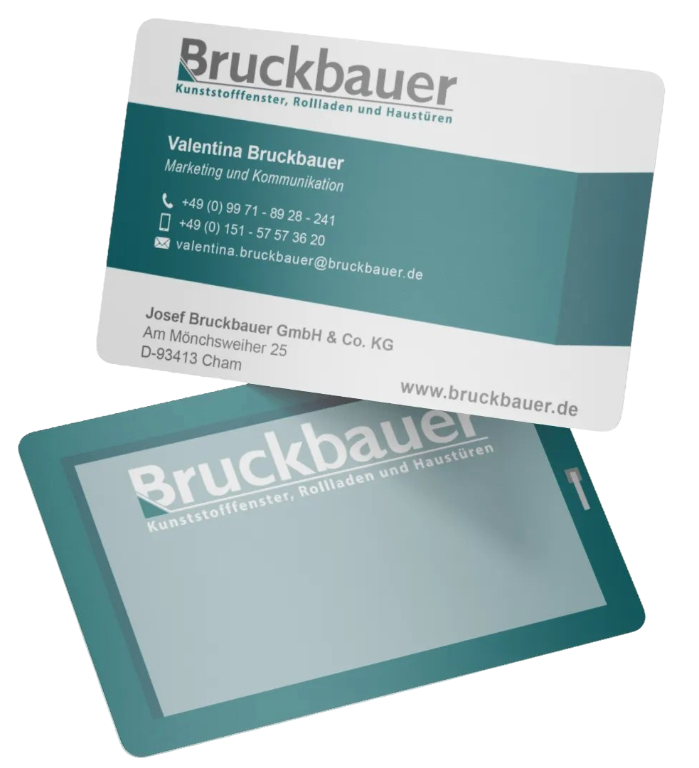 Durch die harmonische Farbwahl und die moderne Typografie wirkt die Karte elegant und zugleich zeitlos. Zudem wurde auf eine hochwertige Druckqualität geachtet, um einen professionellen ersten Eindruck zu hinterlassen. Die Visitenkarte spiegelt damit das Corporate Design des Unternehmens wider und unterstreicht die Seriosität sowie die Kundennähe der Firma Bruckbauer.